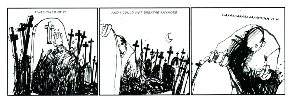 Bård Larsson är en suverän tecknare med en väldigt levande, smutsig och dynamisk teckningsstil. Hans svartvita teckningar har ett väldigt unikt uttryck som det är svårt att slita ögonen från, och som dessutom rimmar utmärkt med seriernas mörka berättelser och teman. Den inledande sekvensen där fadern gräver sig upp ur en smutsig grav på kyrkogården hör till fanzinets visuellt sett vackraste partier. Det enda som stör den visuella upplevelsen är datortextningen, som ofta skär sig ganska mycket mot de livfulla teckningarna.