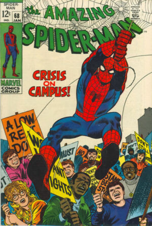 ”Crisis on Campus” i Amazing Spider-Man nummer 68 var en av få gånger som 1960-talets studentprotester märktes av i serien. Omslag av John Romita och Jim Mooney. © Marvel Comics