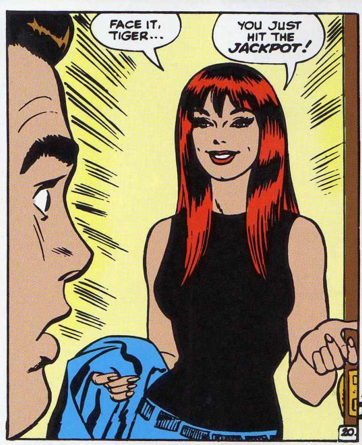 Mary Janes första riktiga framträdande skedde i Amazing Spider-Man nummer 42. John Romitas bakgrund inom romantikgenren var en viktig del i att Peter Parker nu fick ett socialt liv. © Marvel Comics