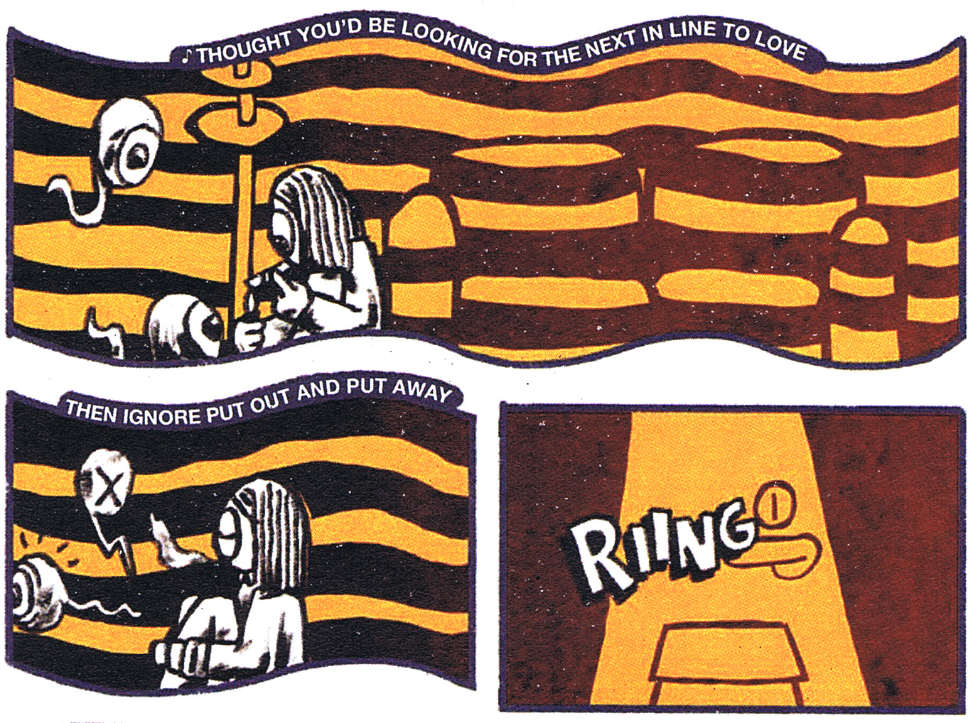 Denna semi-avantgardistiska kärlekshistoria av Torkel Tirén är ett av årets konstnärligt intressantare fanzinpublikationer. Redan omslaget, föreställandes en uråldrig mesopotamisk statyett (ett återkommande moment i serien) talar för att de estetiska ambitionerna skiljer sig en del från det gängse inom fanzinscenen. Teckningsstilen är experimentell och lovar mycket när det gäller känslan för dekorativa bakgrunder och lågmälda men uttrycksfulla karaktärer. Vi bjuds därtill på ett mustigt “soundtrack” i samband med vissa bildsekvenser, beståendes av låttexter från bl a Björk, Britta Persson och Anna Järvinen. Bara att tacka och ta emot.