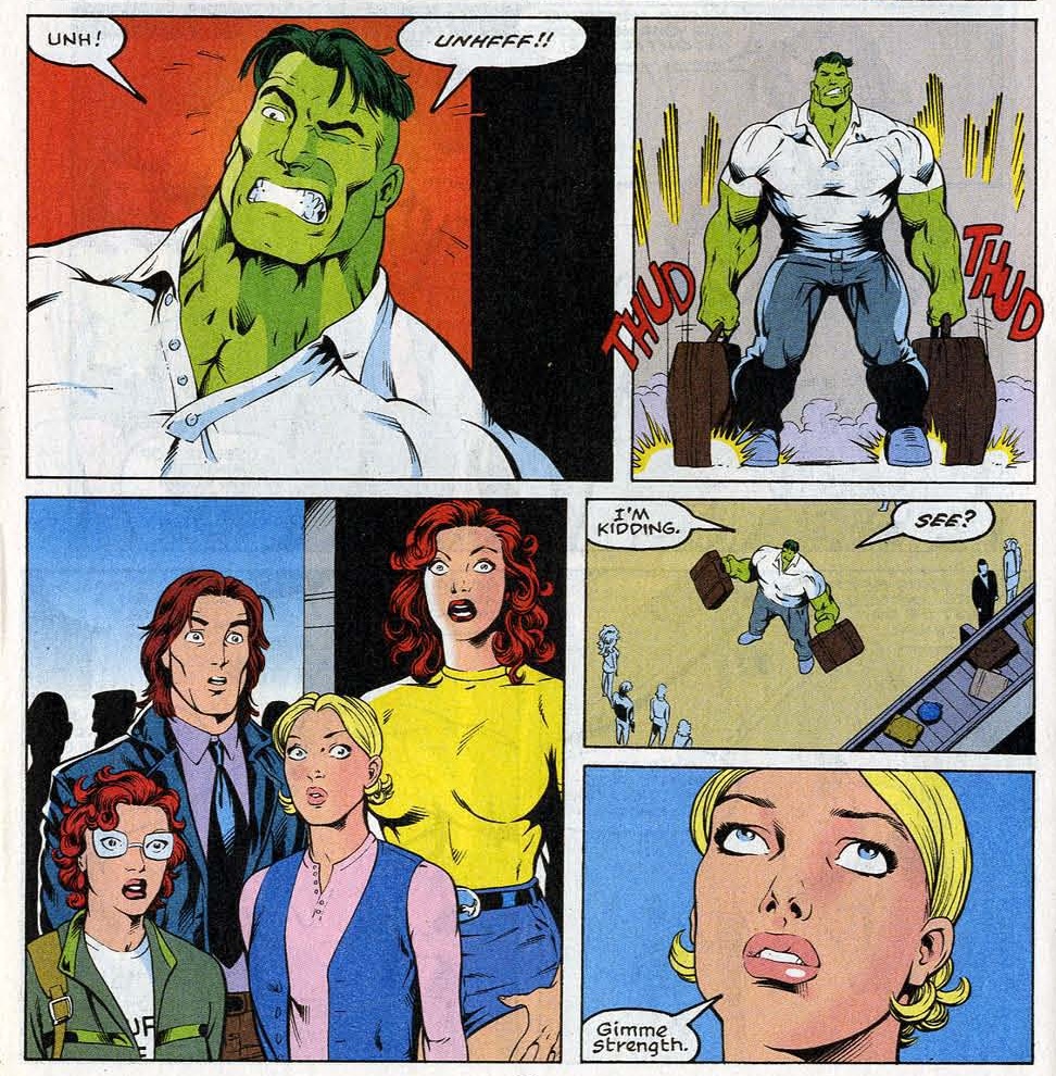 Hulk och hans närmaste vänner var som en stor familj och Hulk började dra pappaskämt om att kvinnor packar mycket. © Marvel Comics